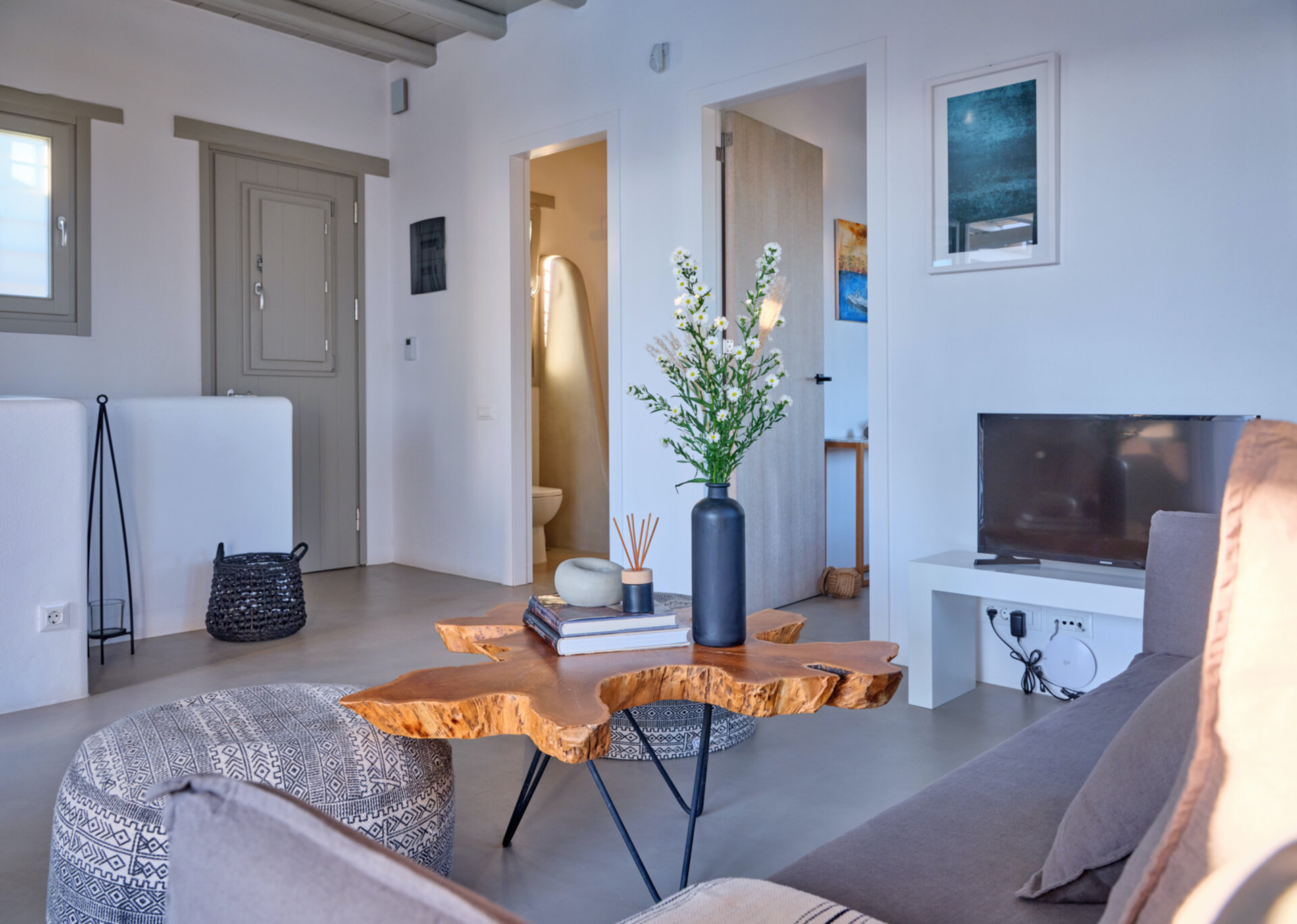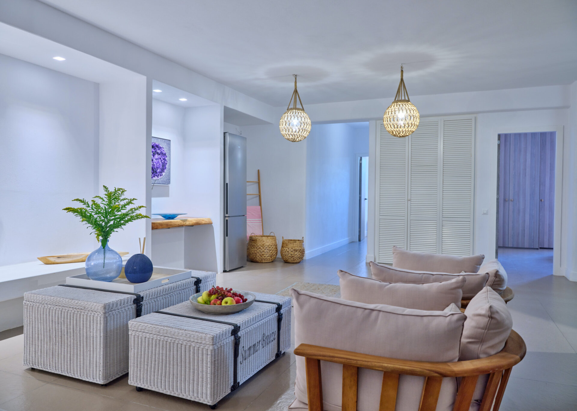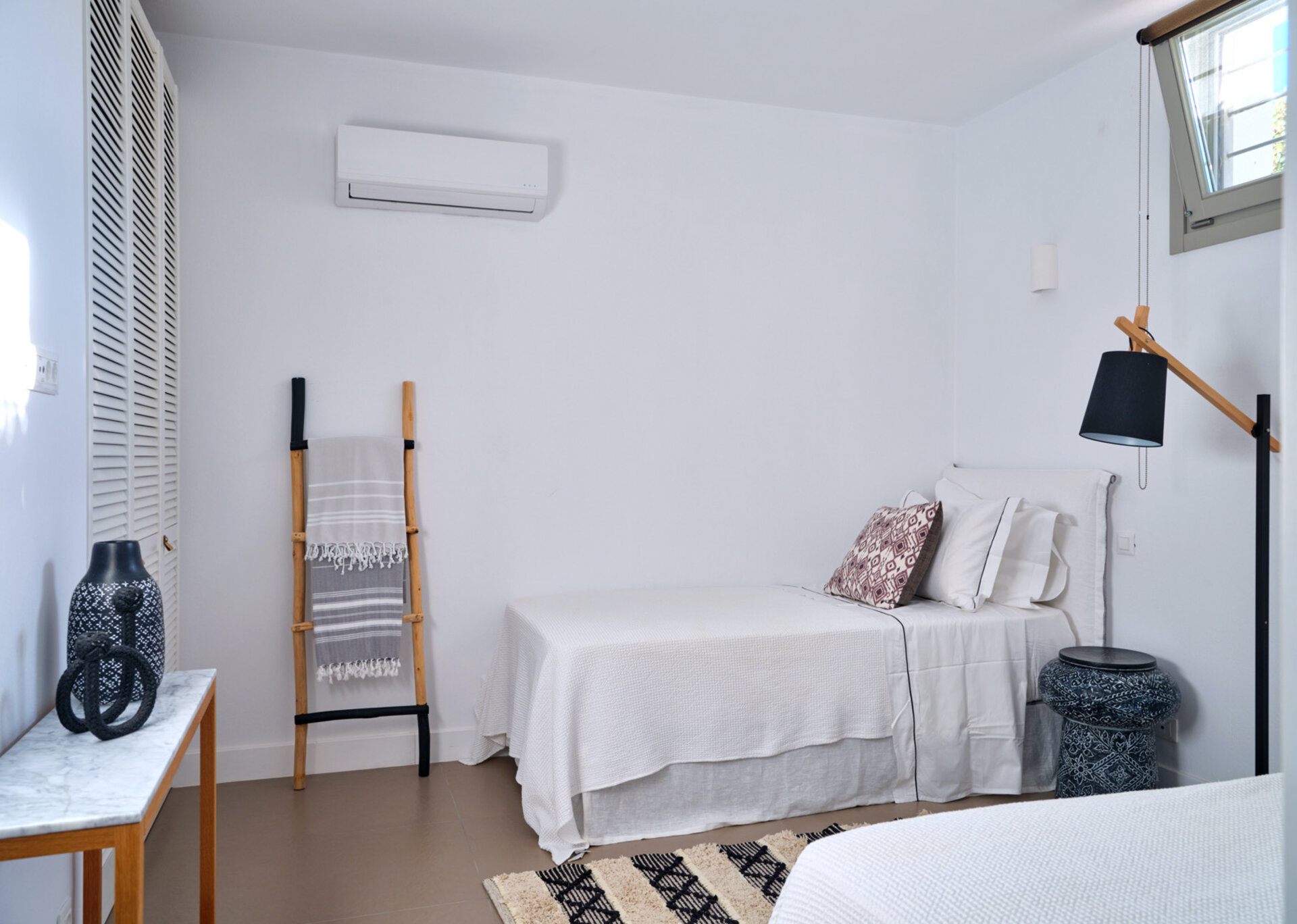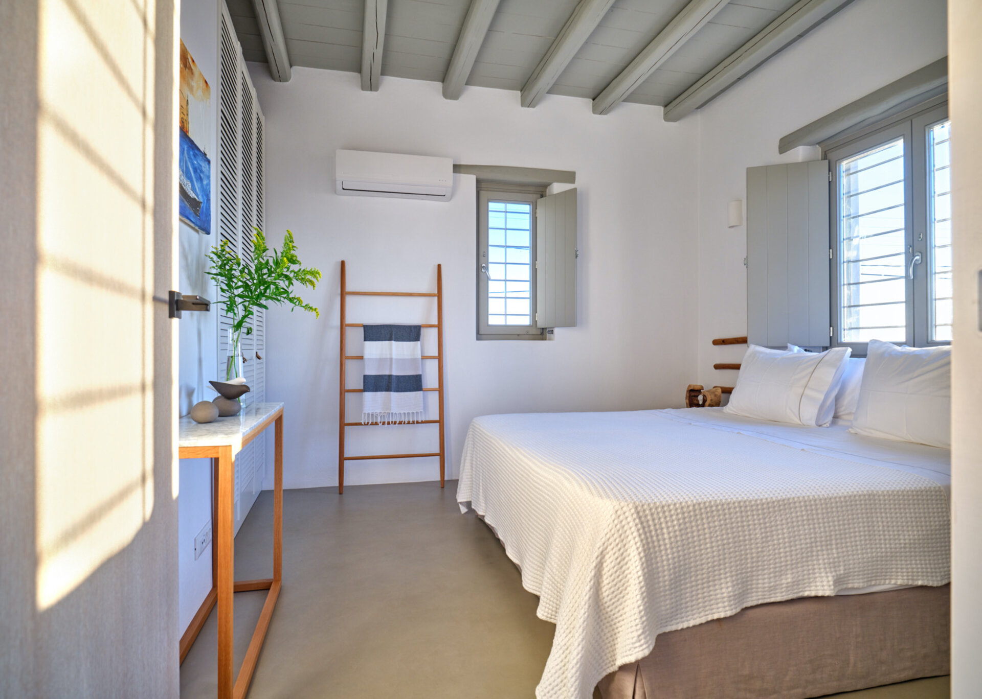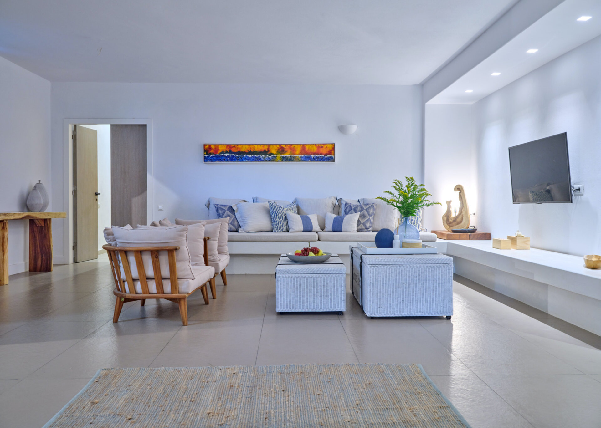 The main villa building is dominated by a modern living room which is complemented by a dining area that can comfortably accommodate up to ten people. The adjacent open plan kitchen is fully equipped with the latest appliances. Two double bedrooms (not ensuite) can be also on this level.