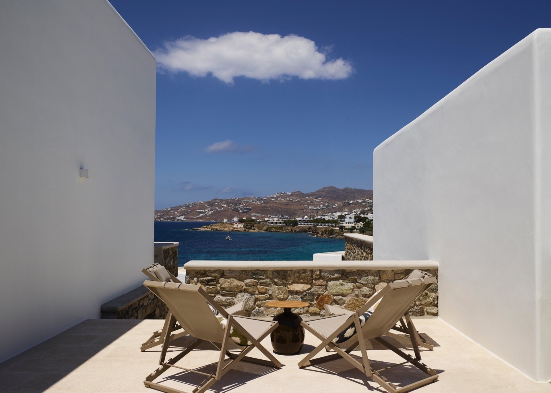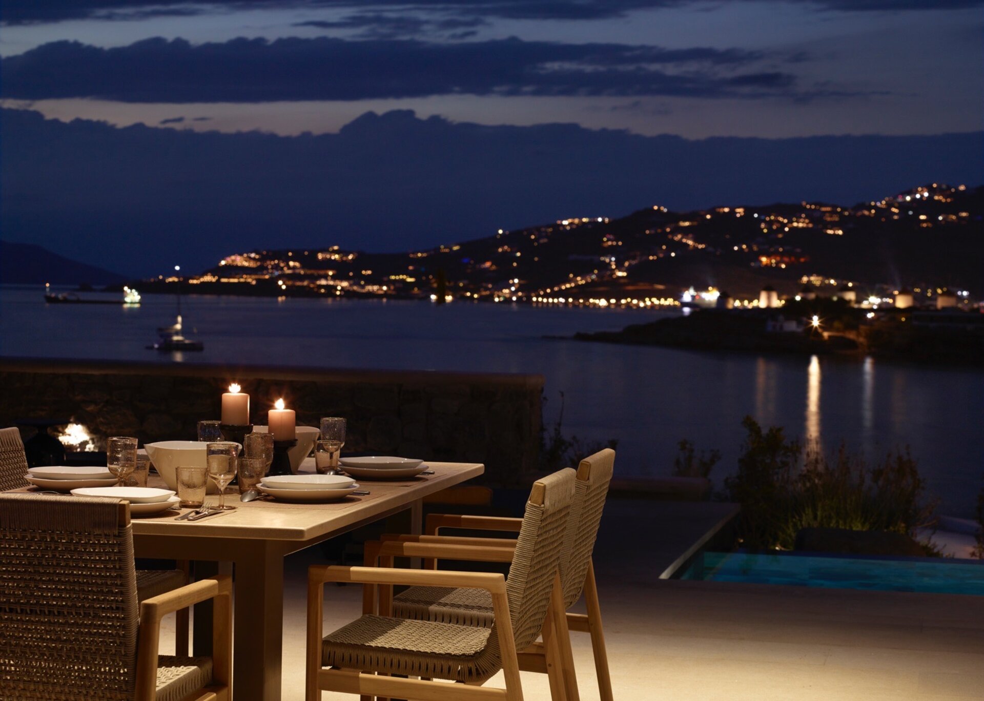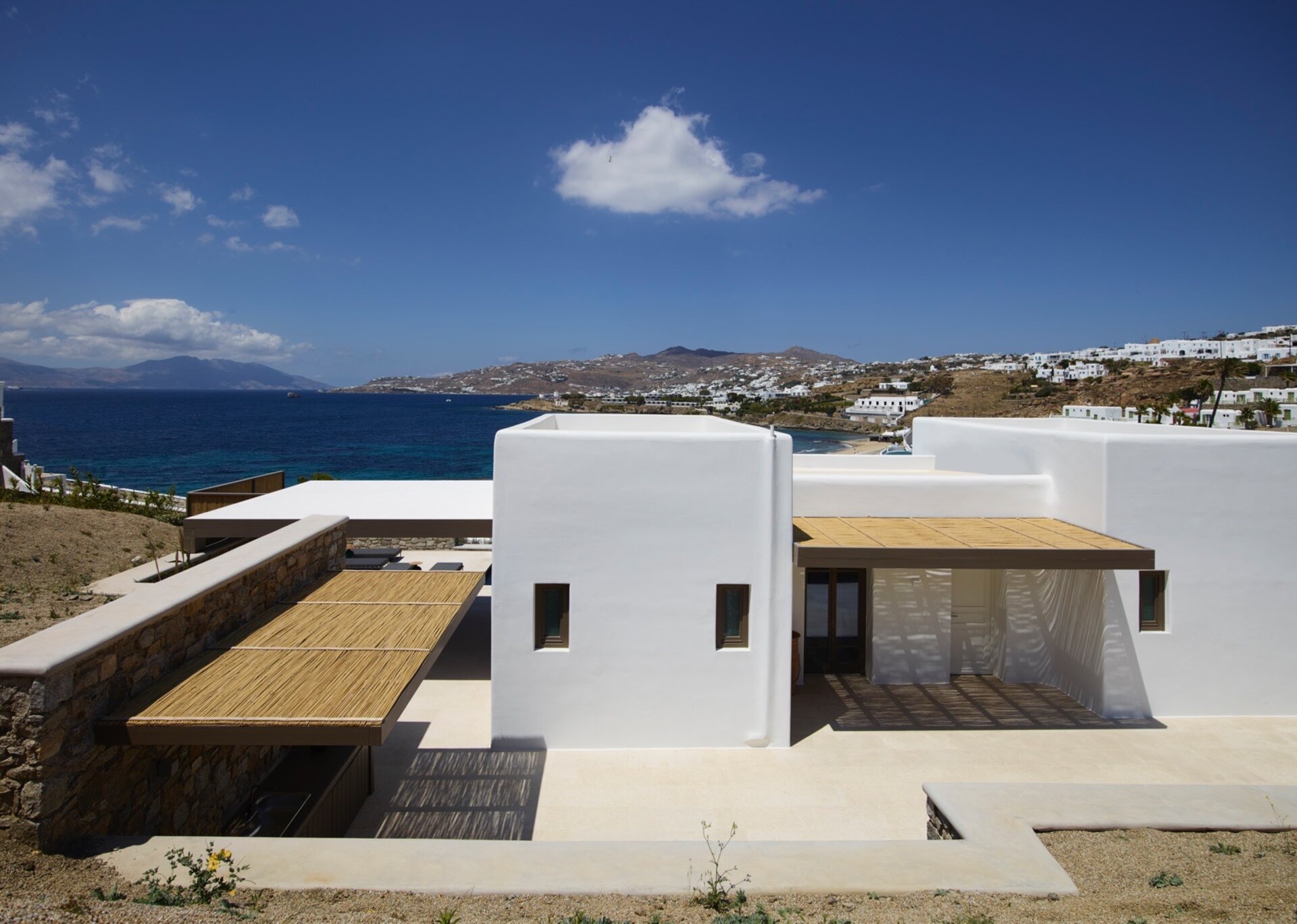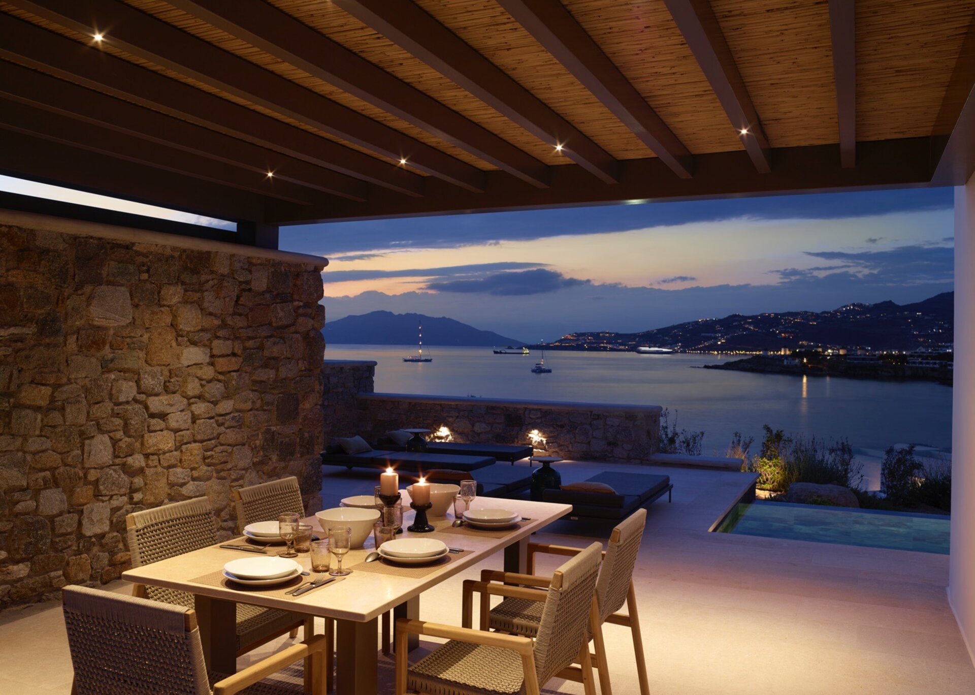 Treat yourself to true indulgence and enjoy spacious open-plan living with a stay at villa Wisdom. Built into two levels, it takes advantage of its elevated position, boasting superb sea views from almost every angle and providing an intimate retreat for your dreamlike Mykonian vacation. It comes complete with expansive outdoor living areas, perfect for soaking in the sun and enjoying the view by the 6m private heated pool. Though the villa takes its design cues from the traditional Cycladic architecture, its modern layout and furnishings lend a contemporary edge to its ambience. An all-white interior perfectly offsets the vivid-hued landscape outside and lends the space a feeling of uncluttered airiness, while the accents of granite and marble add up to the villa’s elegant feel. From the kitchenette and living room area, guests have easy access to the terrace and can enjoy the surrounding view.