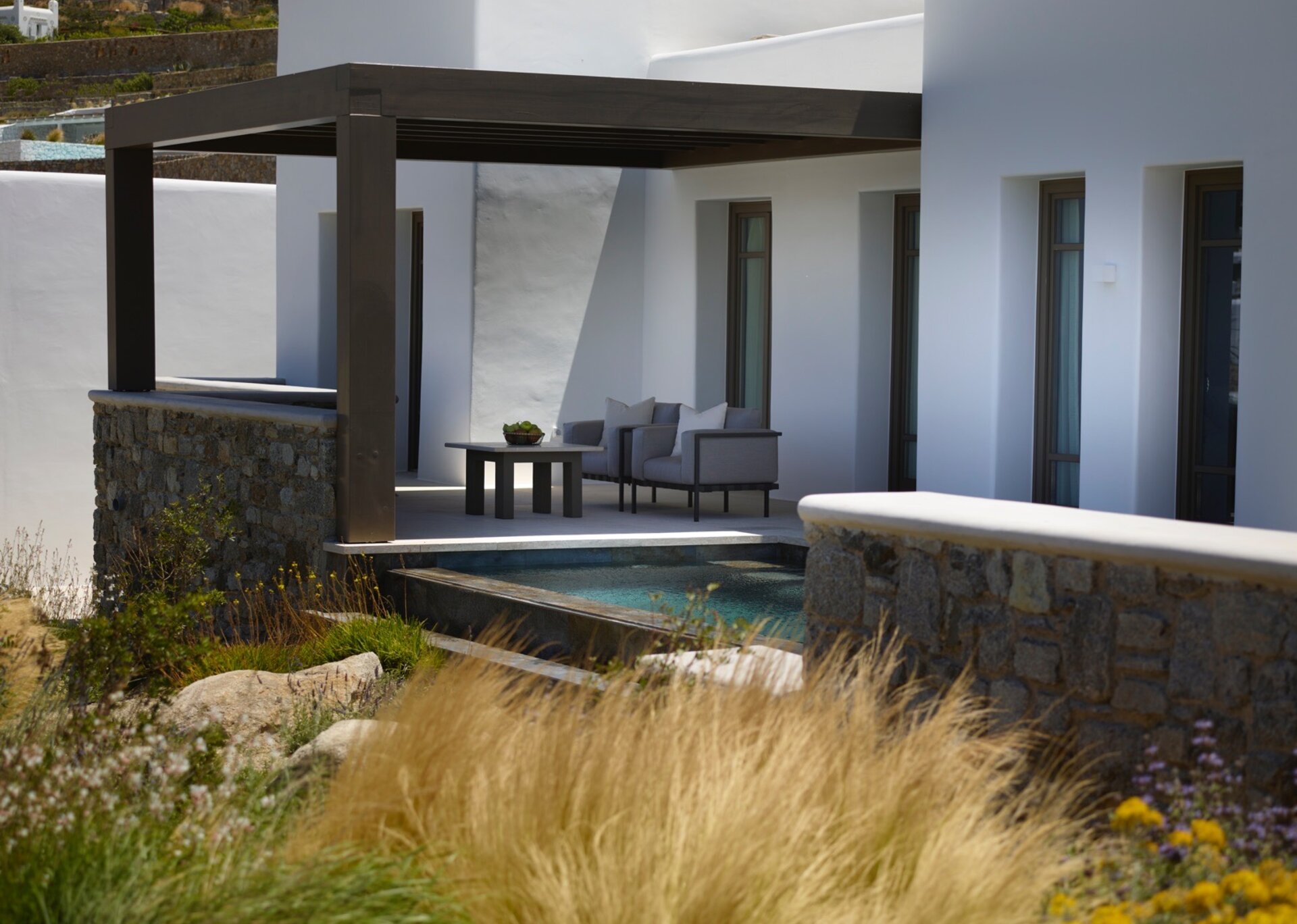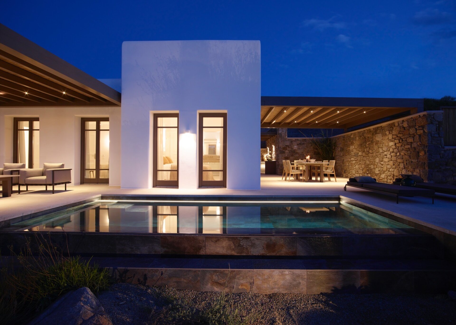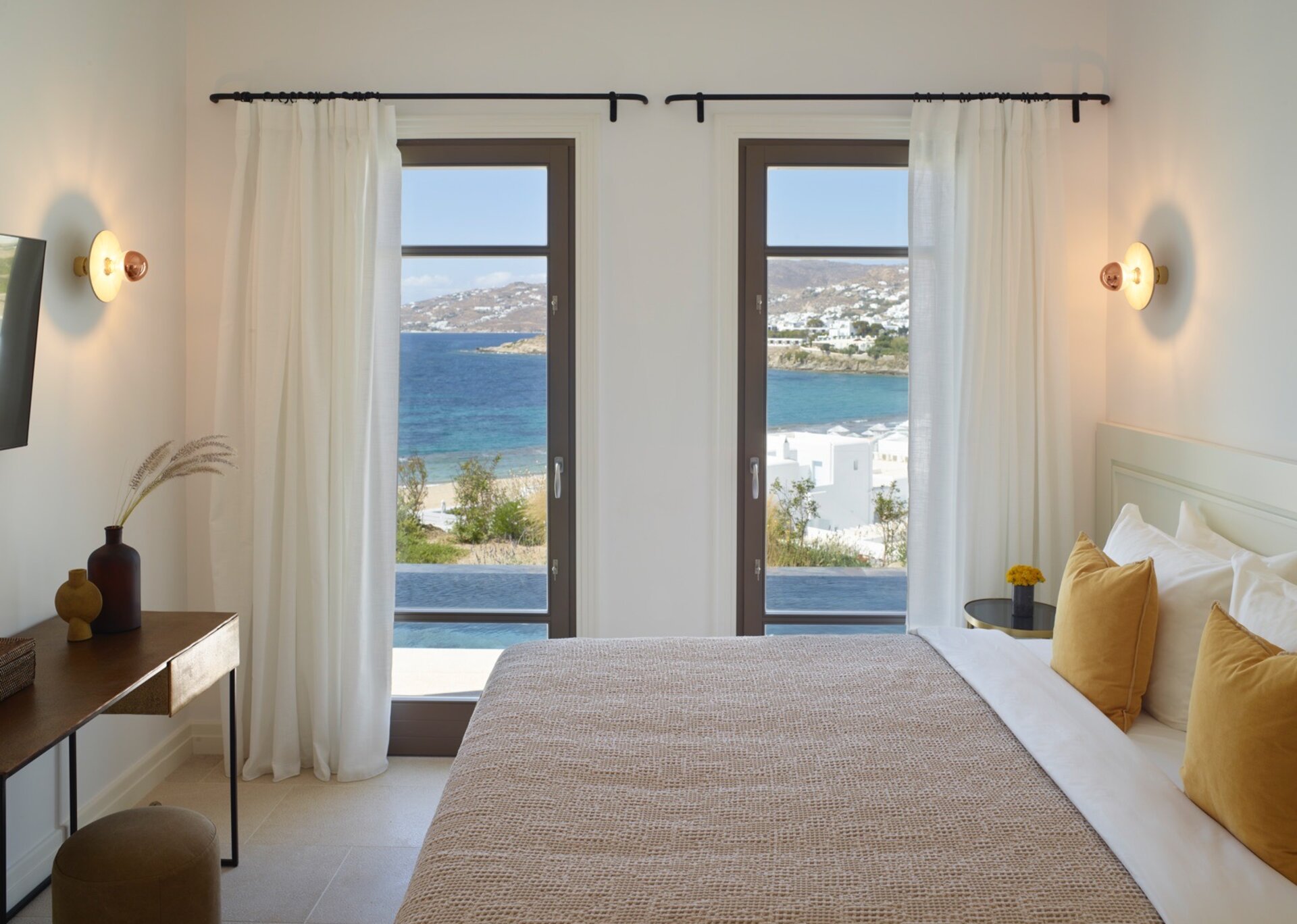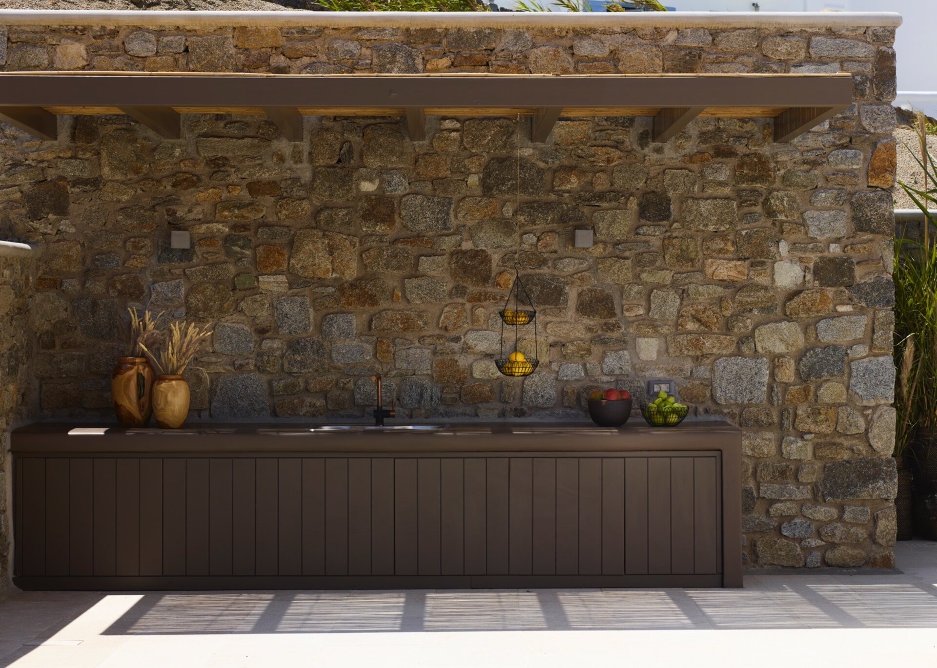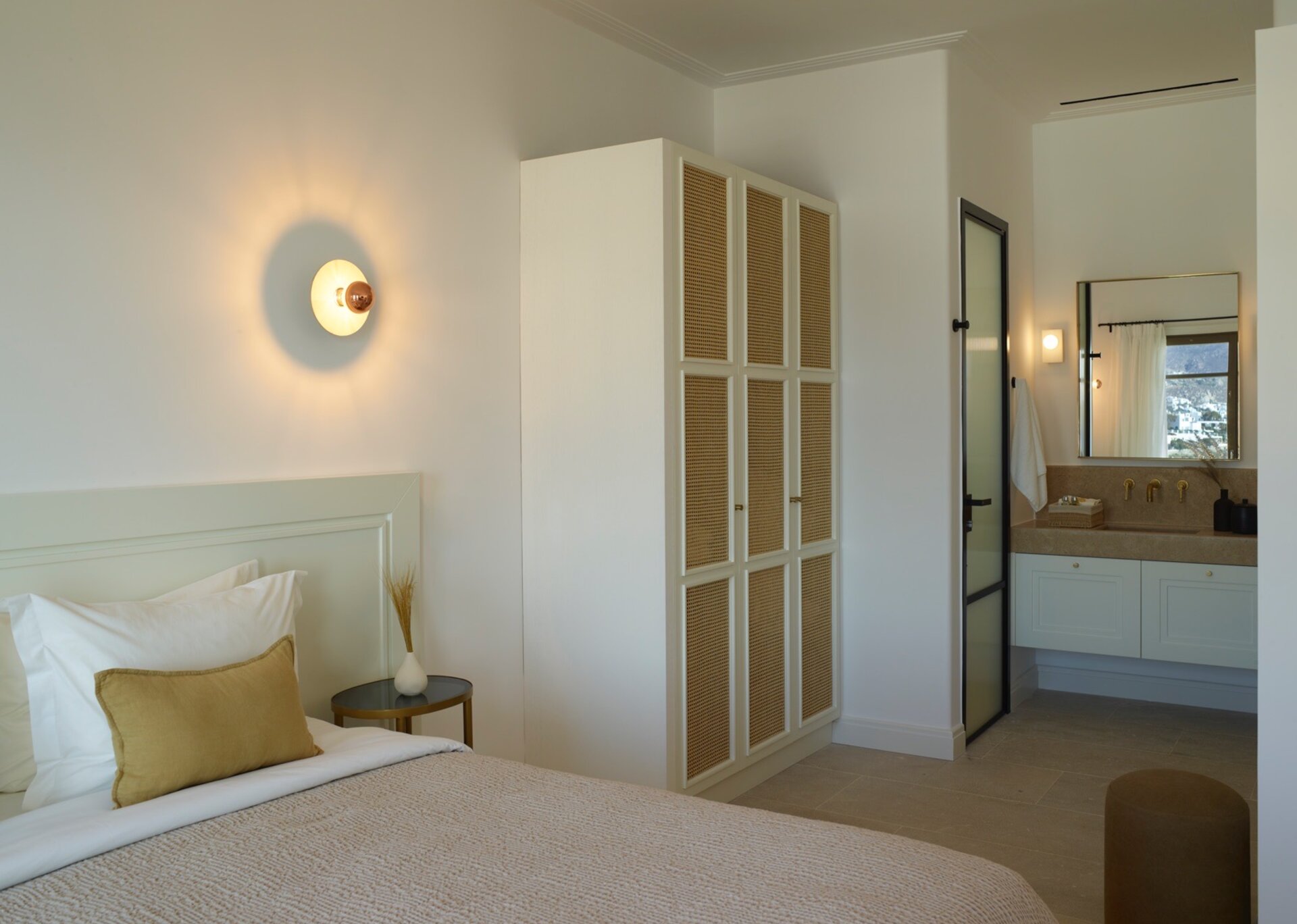 Treat yourself to true indulgence and enjoy spacious open-plan living with a stay at villa Wisdom. Built into two levels, it takes advantage of its elevated position, boasting superb sea views from almost every angle and providing an intimate retreat for your dreamlike Mykonian vacation. It comes complete with expansive outdoor living areas, perfect for soaking in the sun and enjoying the view by the 6m private heated pool. Though the villa takes its design cues from the traditional Cycladic architecture, its modern layout and furnishings lend a contemporary edge to its ambience. An all-white interior perfectly offsets the vivid-hued landscape outside and lends the space a feeling of uncluttered airiness, while the accents of granite and marble add up to the villa’s elegant feel. From the kitchenette and living room area, guests have easy access to the terrace and can enjoy the surrounding view.