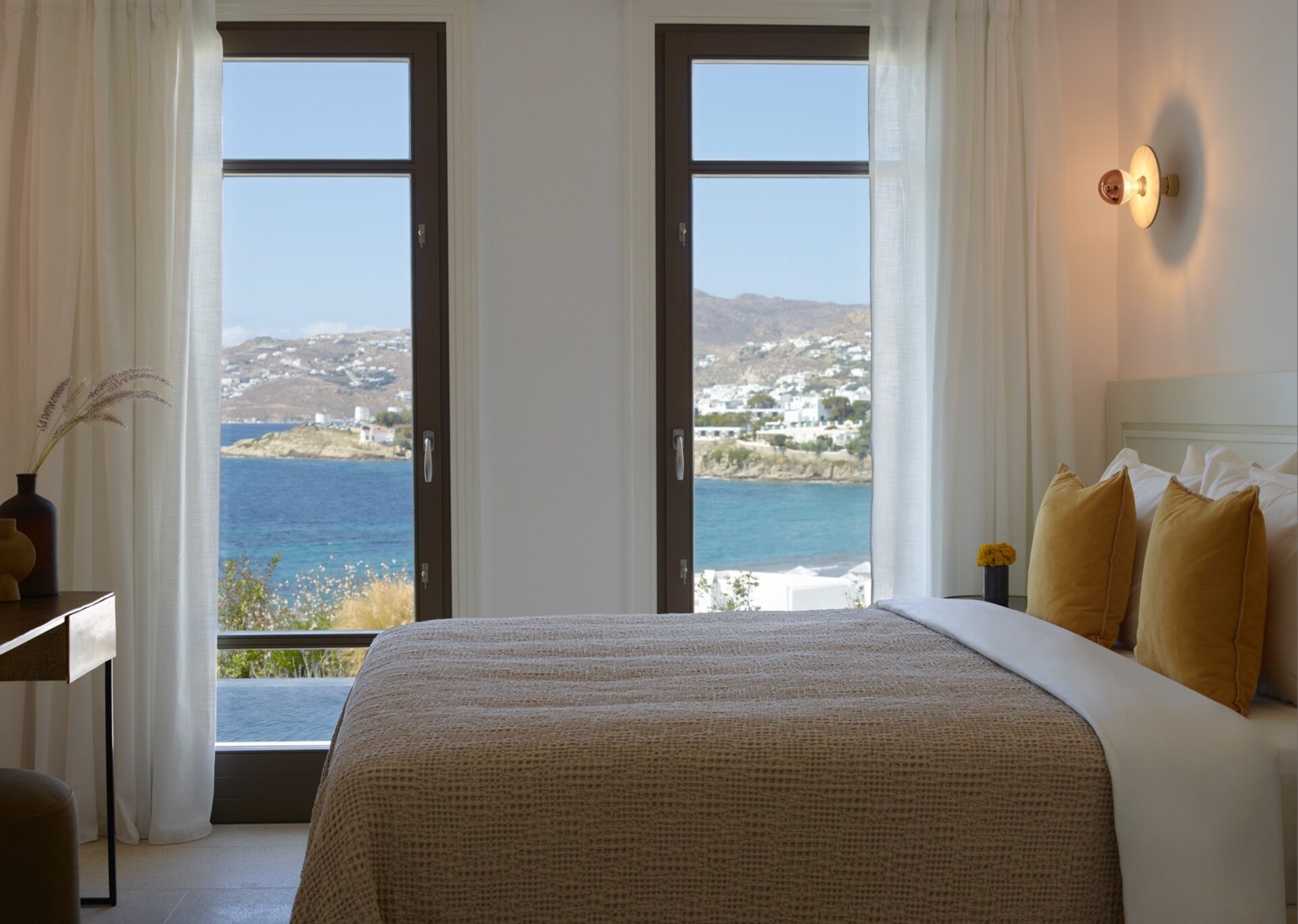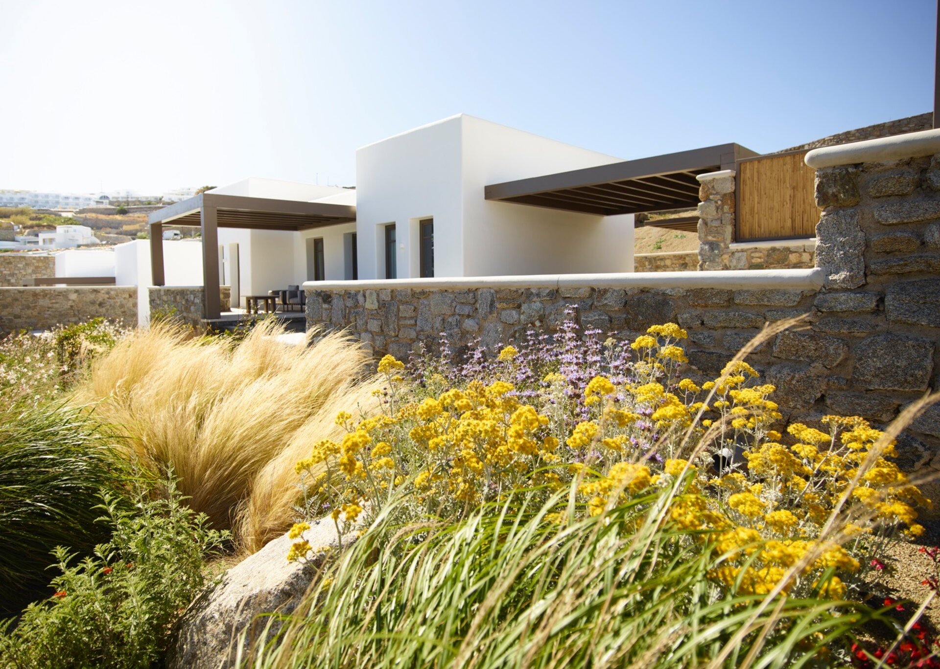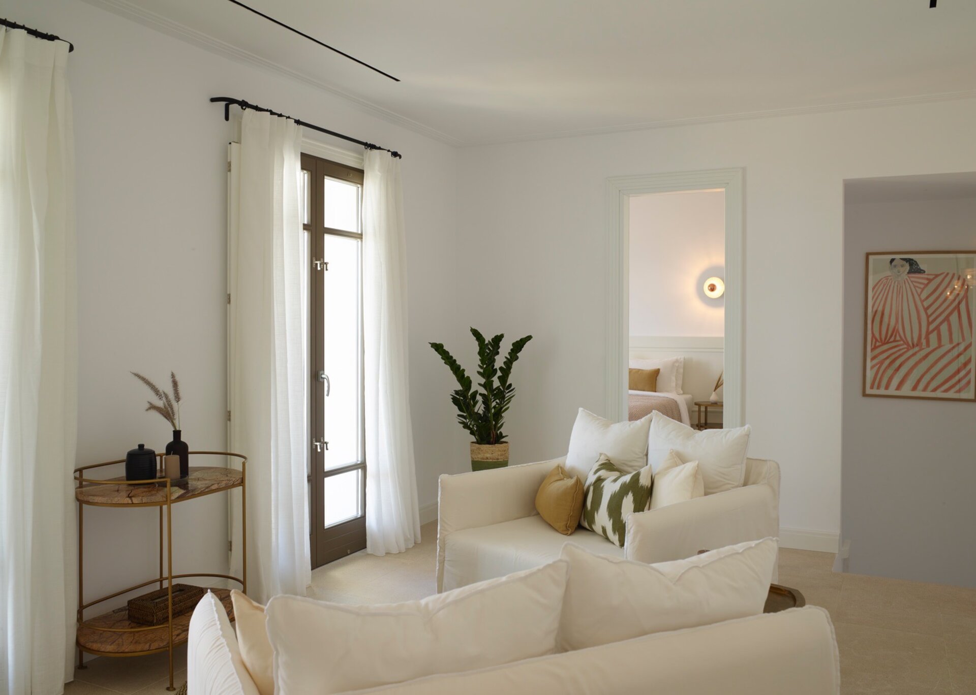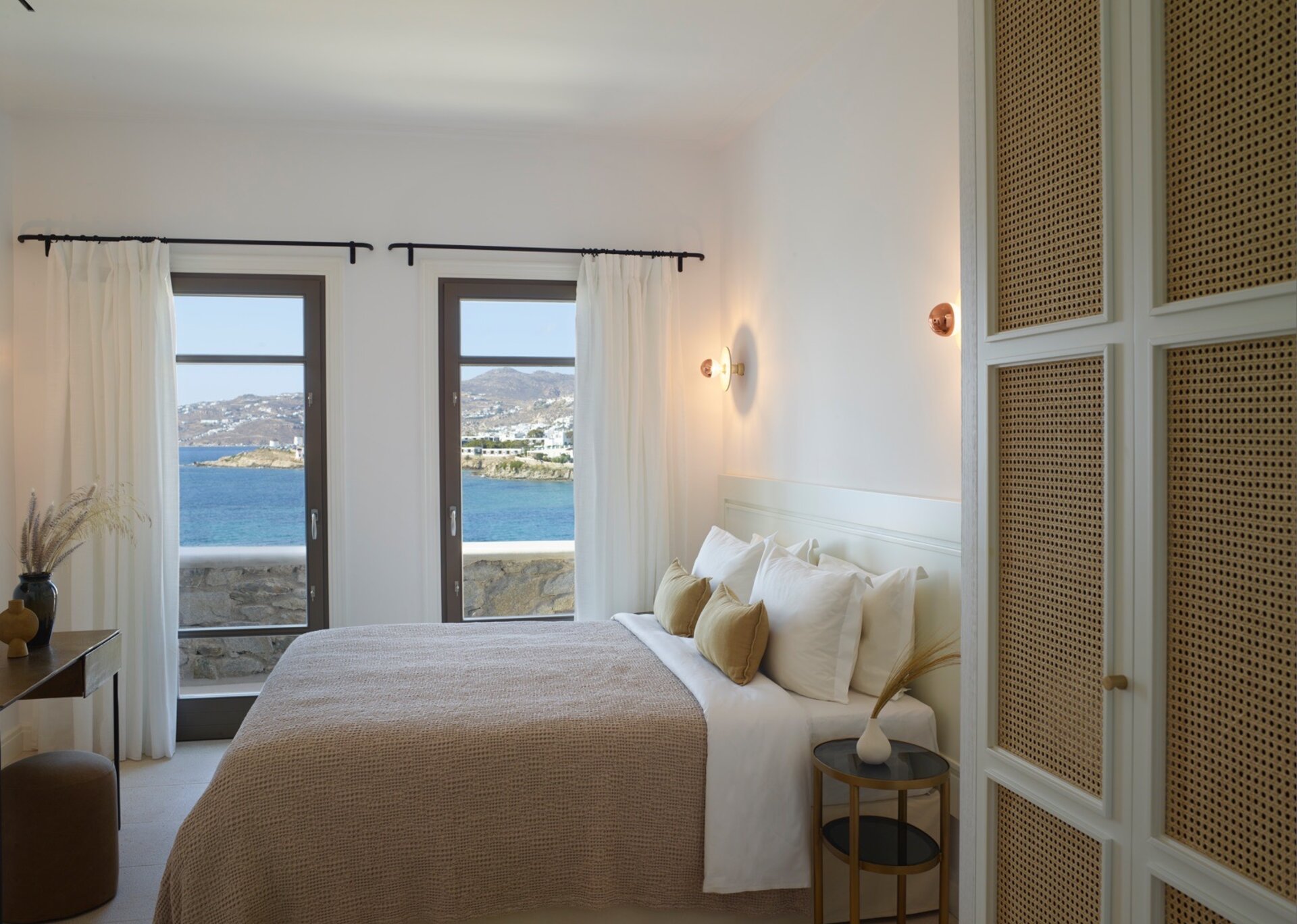 Treat yourself to true indulgence and enjoy spacious open-plan living with a stay at villa Wisdom. Built into two levels, it takes advantage of its elevated position, boasting superb sea views from almost every angle and providing an intimate retreat for your dreamlike Mykonian vacation. It comes complete with expansive outdoor living areas, perfect for soaking in the sun and enjoying the view by the 6m private heated pool. Though the villa takes its design cues from the traditional Cycladic architecture, its modern layout and furnishings lend a contemporary edge to its ambience. An all-white interior perfectly offsets the vivid-hued landscape outside and lends the space a feeling of uncluttered airiness, while the accents of granite and marble add up to the villa’s elegant feel. From the kitchenette and living room area, guests have easy access to the terrace and can enjoy the surrounding view.