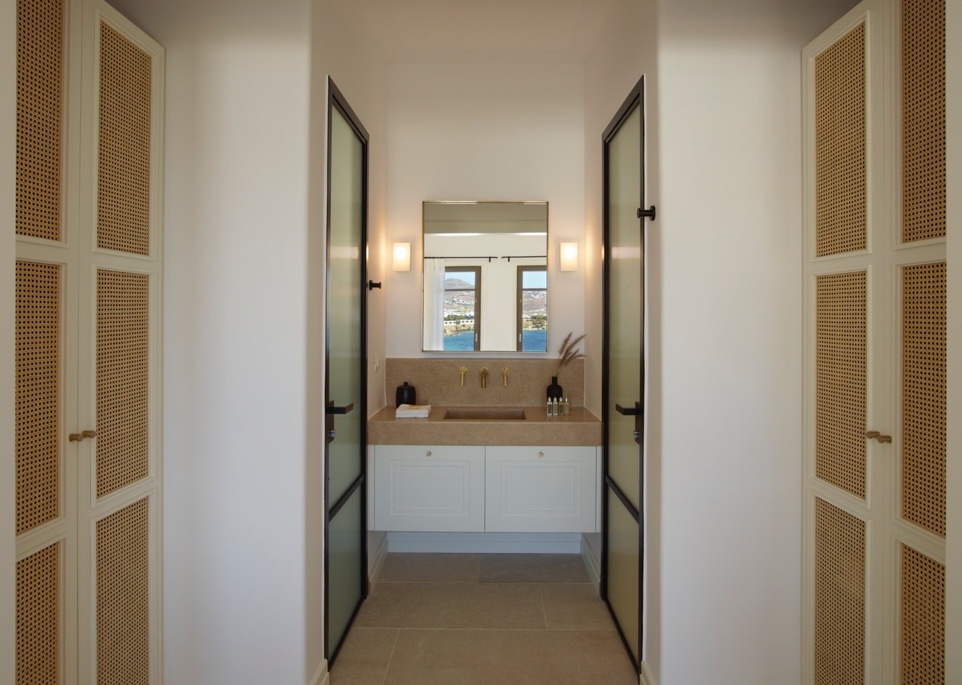 This villa’s three spacious bedrooms can easily accommodate up to six adults and one infant. On the ground level you’ll find two bedrooms with King Size Beds and en-suite bathrooms, while a third one offers ultimate privacy at the lower level of the villa, featuring a King Size Bed or Twin Beds and en-suite bathroom. Two of the bedrooms overlook at the sea, letting you start the day with a breath of fresh air, while the third one offers view to the beautiful garden around the property. The marble bathrooms are bright with clean lines and featuring a golden washbasin and doors of black iron and glass detailed with wavy patterns.