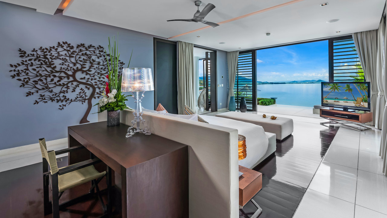 The villas design is a modern minimalist style with a touch of Thai architecture such as the pointed traditional Thai-style roof. The decor represents a perfect mix of modern chic and traditional designs. The villa’s interior is generally minimal with flawless white walls, dotted with stylish furnishings and artworks. At the entrance, guests are welcomed with the spacious living area with plush sofas, marble buddha statues, and not to mentioned the gorgeous ocean view. Directly in front of the villa and only a few steps down, is the relaxing outdoor pool with unbelievable panoramic views of the villa’s surrounding nature.