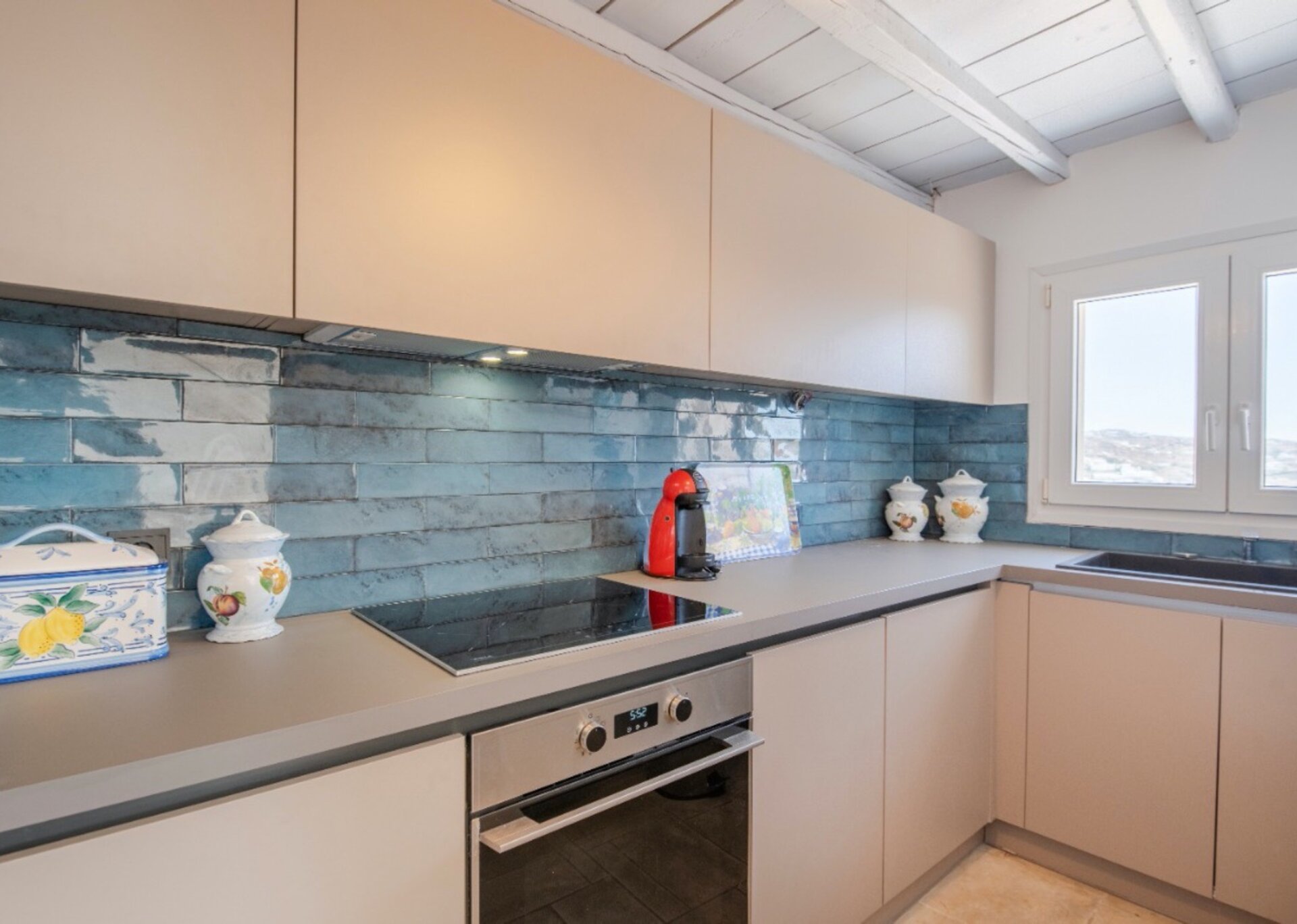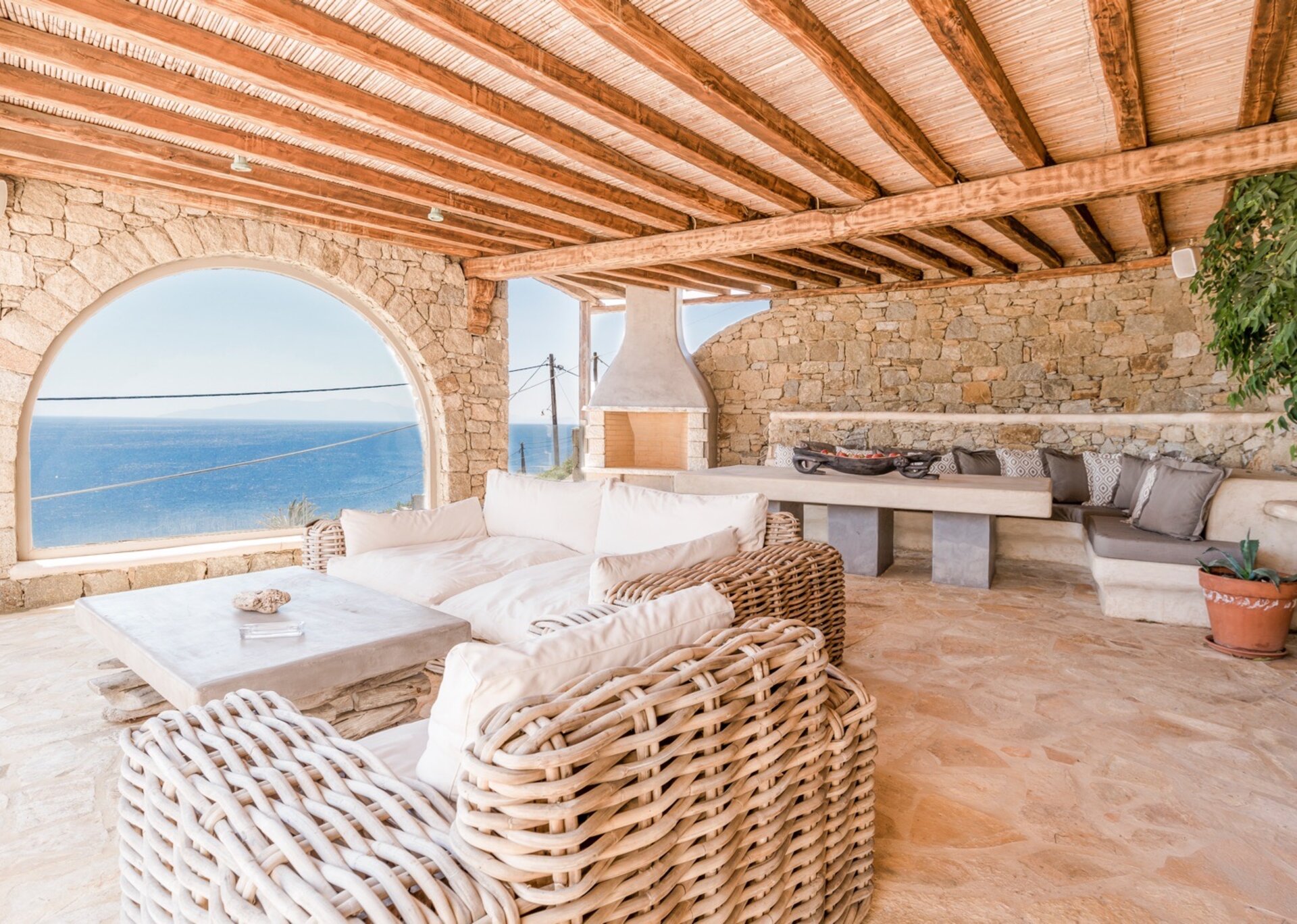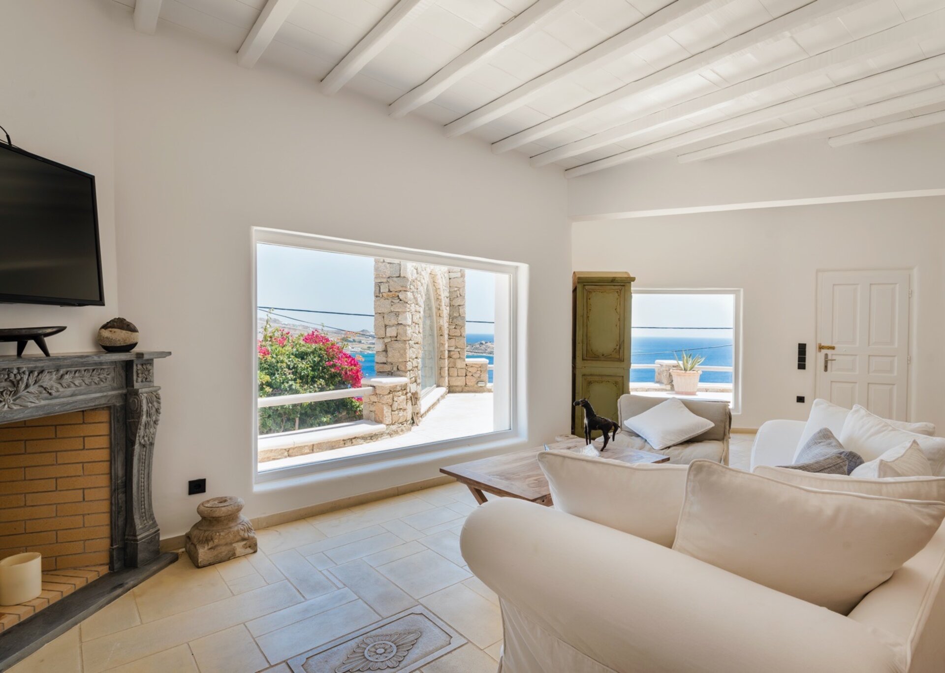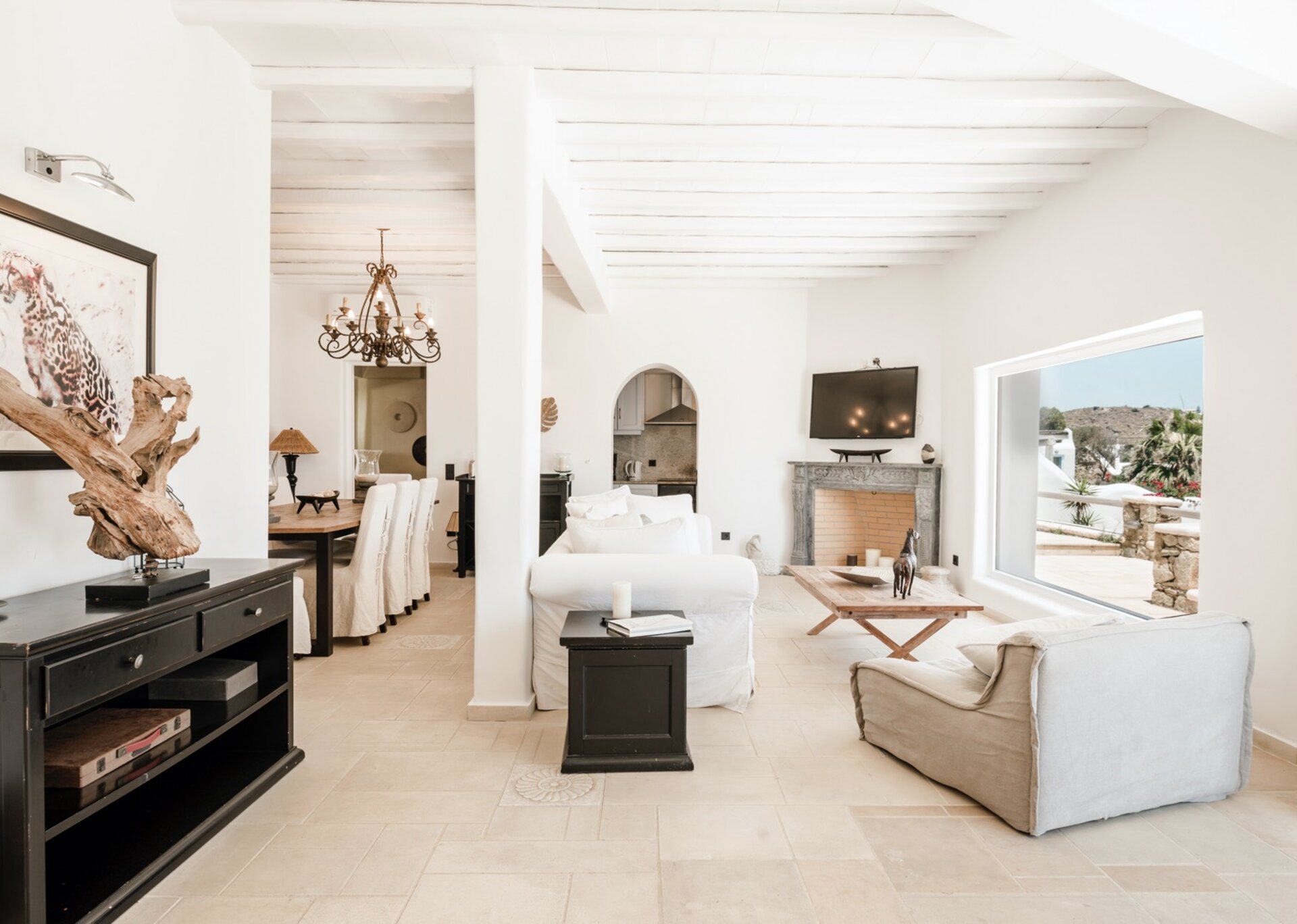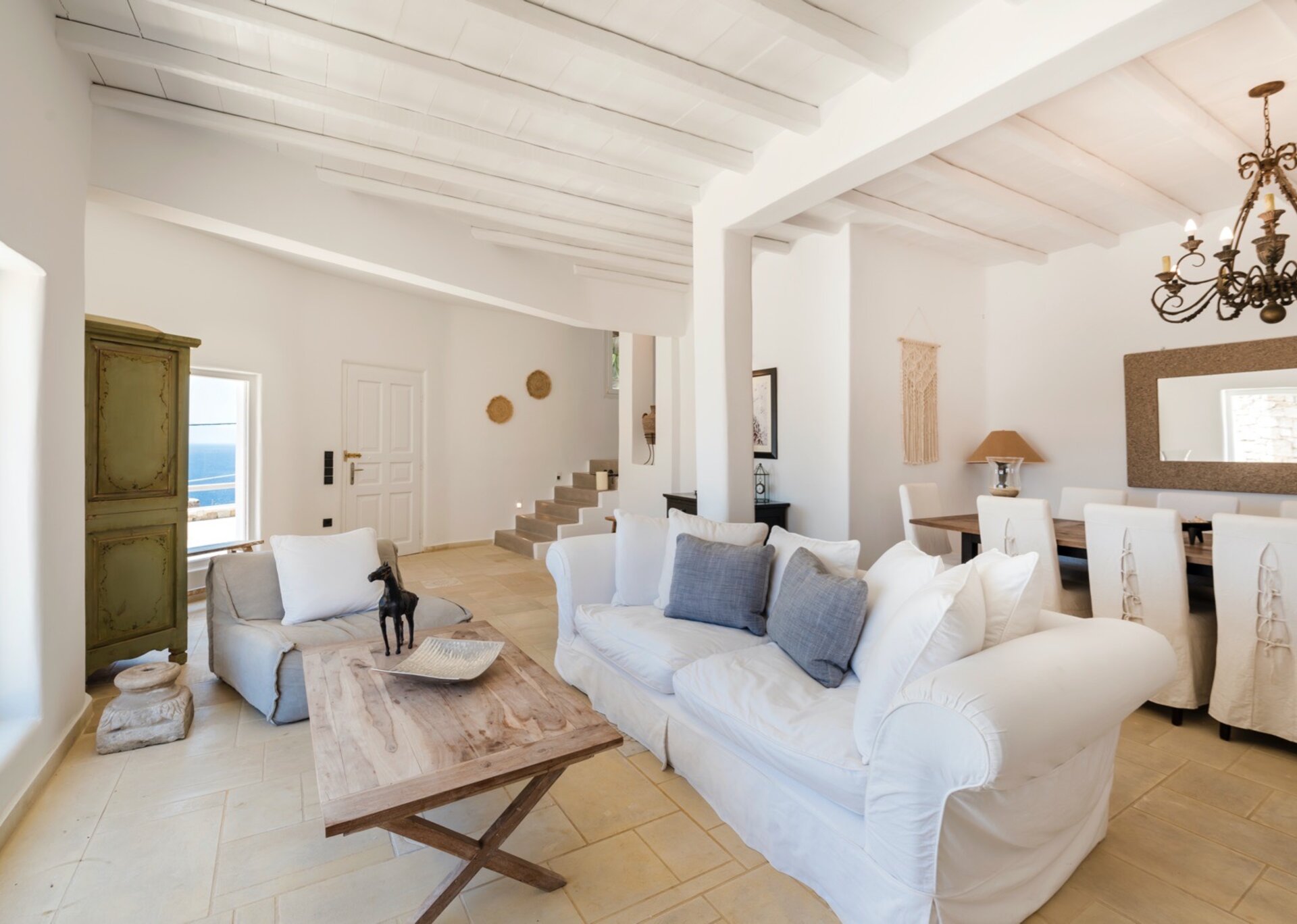 Beyond its impressive facade, the villa's inviting interiors boast of comfortable spaces that seamlessly blend modernity with Cycladic aesthetics. The expansive living room, with its serenely calm atmosphere, offers a perfect haven for relaxation, while the magnificent dining area sets the stage for unforgettable culinary experiences.