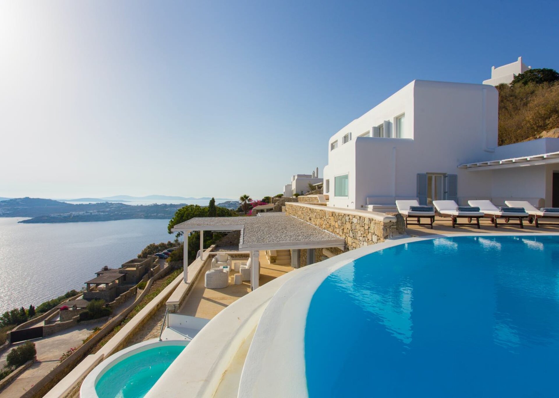A few steps lower, the jacuzzi with room for eight, will definitely be your option for absolute relaxing, looking at the cradle of ancient Greece, the Island of Delos. Although the cosmopolitan beach of Psarou with famed restaurants and chic boutiques is a few minutes away, in villa Zelie you can tranquil and seclude for as long as you need.