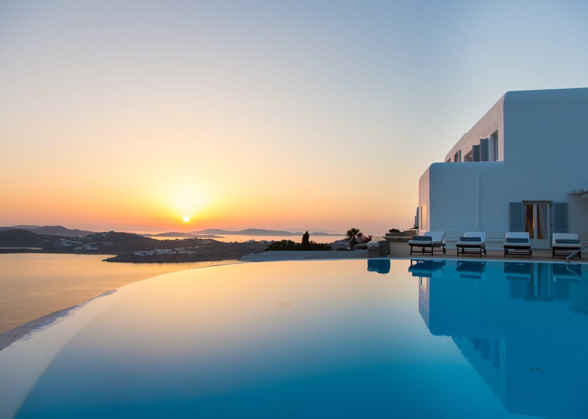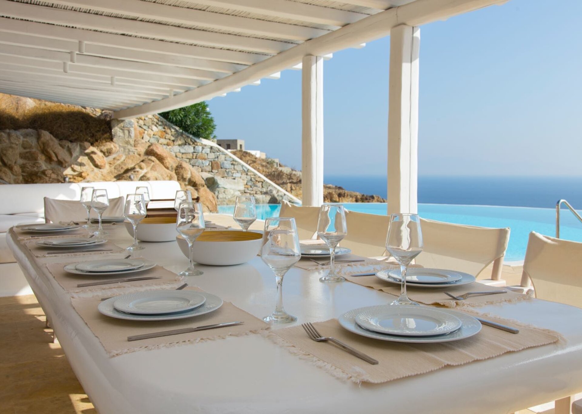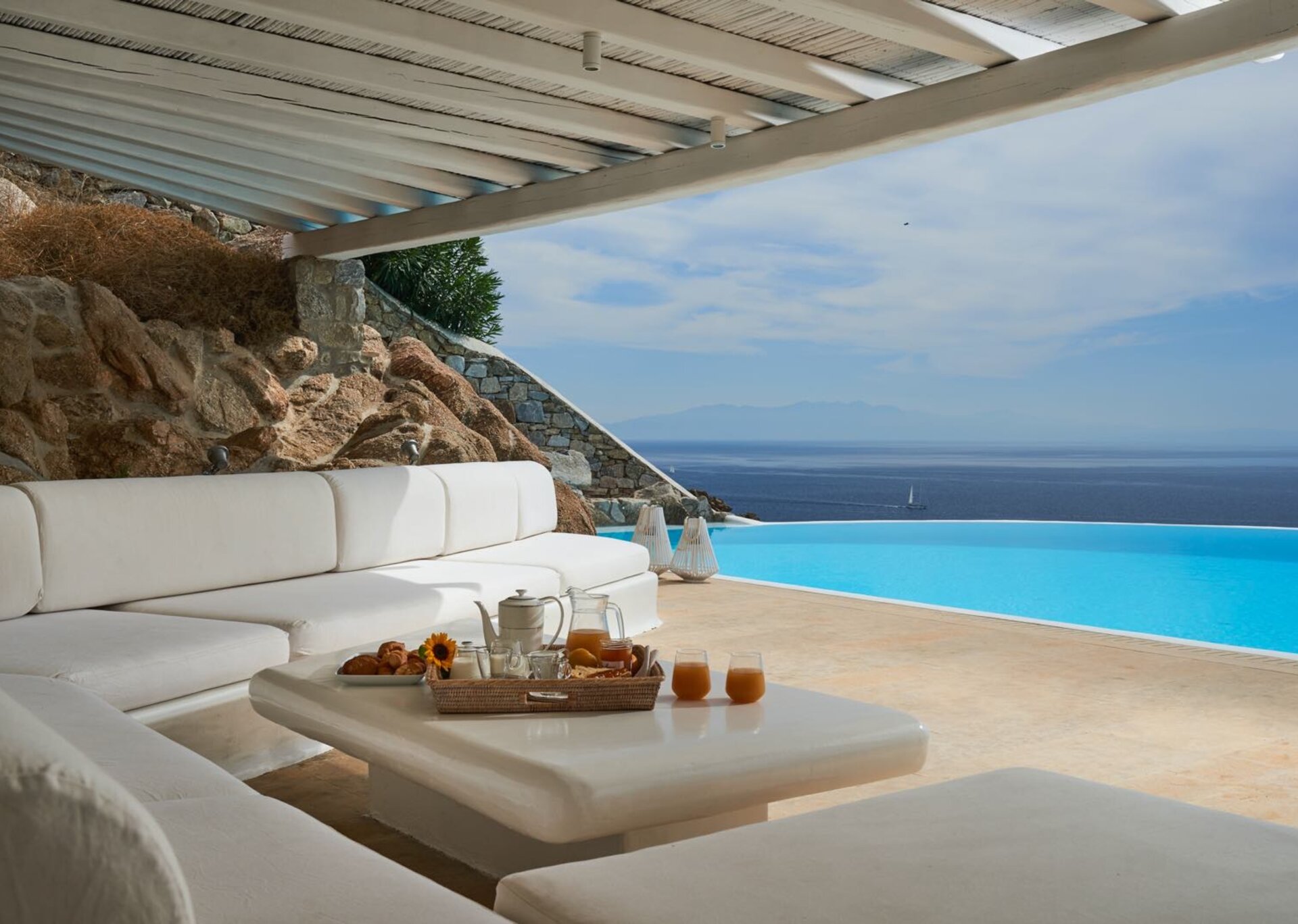 Classy, elegant and functional at the same time, consisting of spacious living areas and terraces, it ensures individuality and privacy to its guests. Plenty of cozy corners with cushioned sofas and tables complete the outdoor scene, the centerpiece of witch is the infinity swimming pool that blends smoothly into the horizon. Whether you choose to lounge under the sun or sit back on one of the pergola-covered spots, this is the perfect setting to enjoy the amazing colors the sky displays day and night.