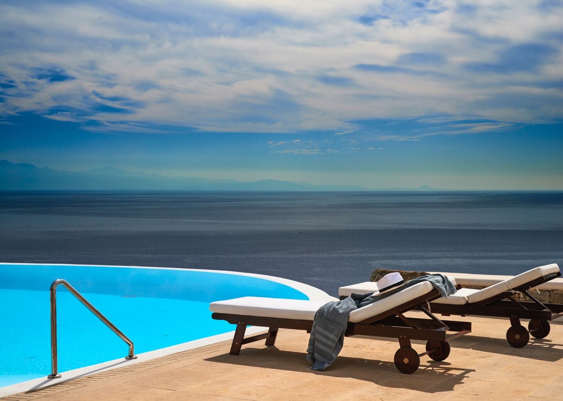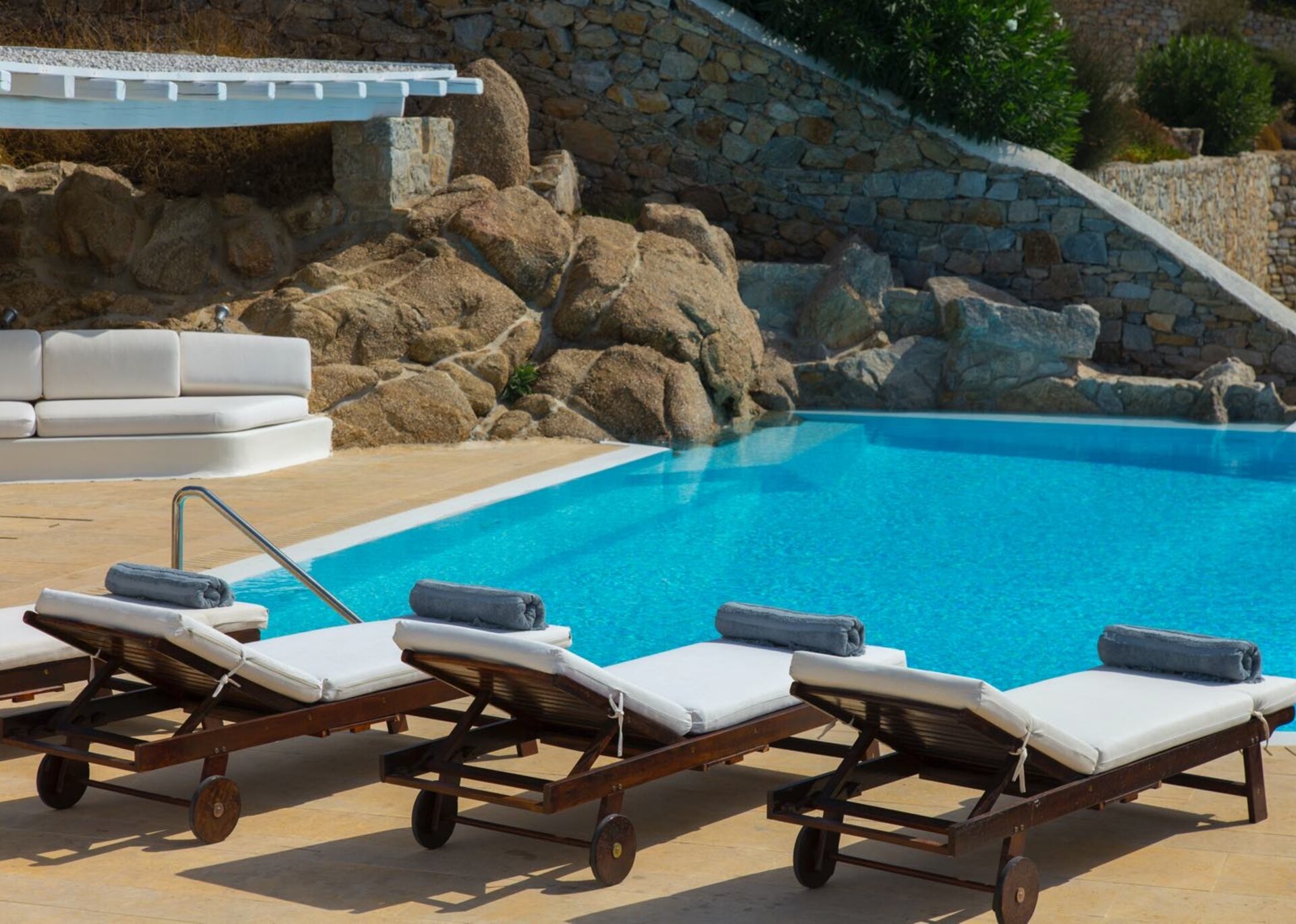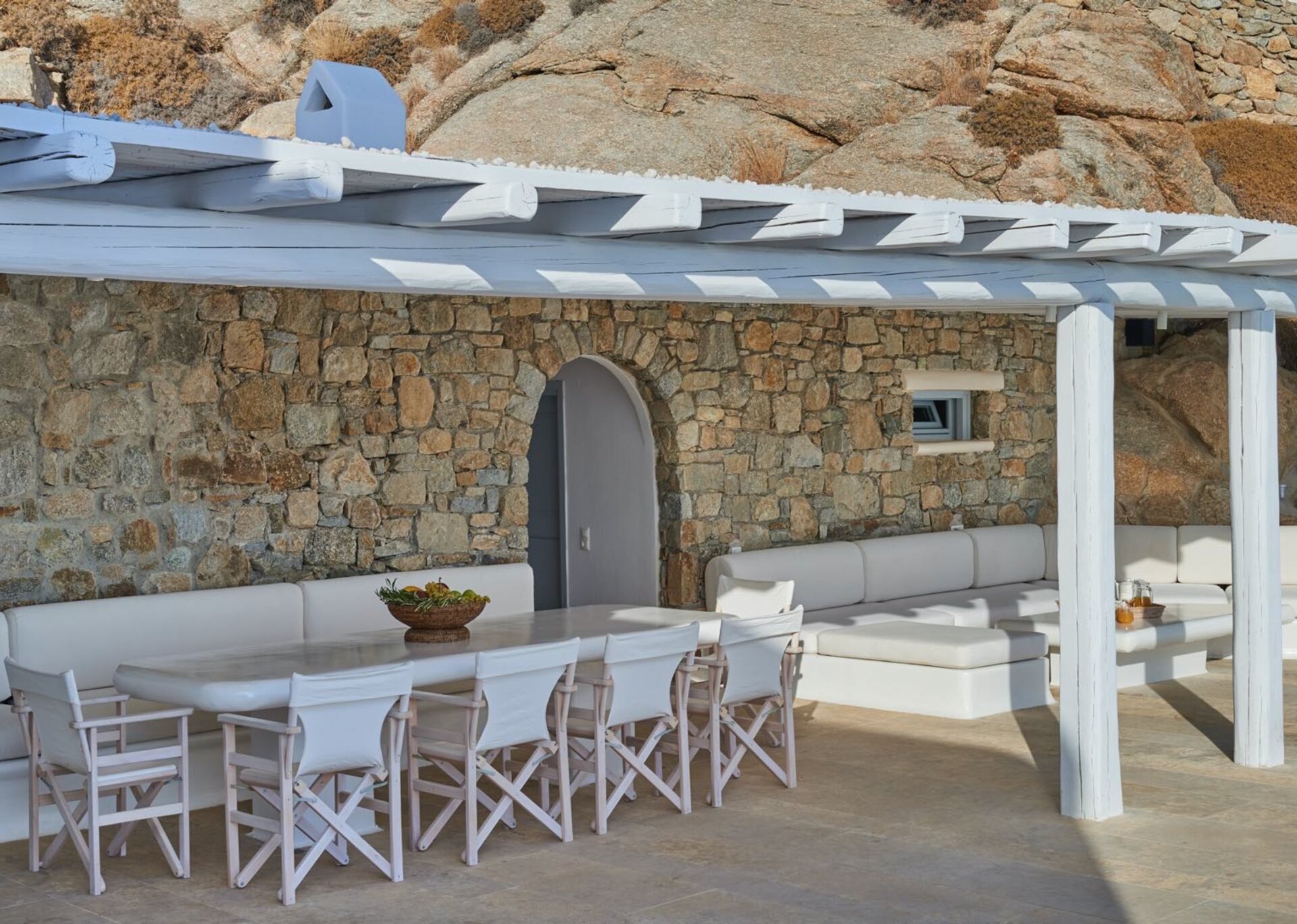 Classy, elegant and functional at the same time, consisting of spacious living areas and terraces, it ensures individuality and privacy to its guests. Plenty of cozy corners with cushioned sofas and tables complete the outdoor scene, the centerpiece of witch is the infinity swimming pool that blends smoothly into the horizon. Whether you choose to lounge under the sun or sit back on one of the pergola-covered spots, this is the perfect setting to enjoy the amazing colors the sky displays day and night.