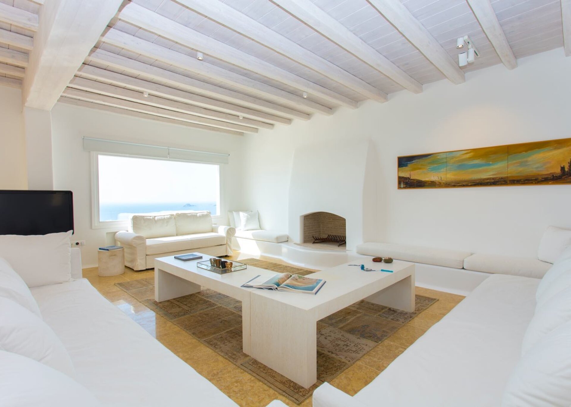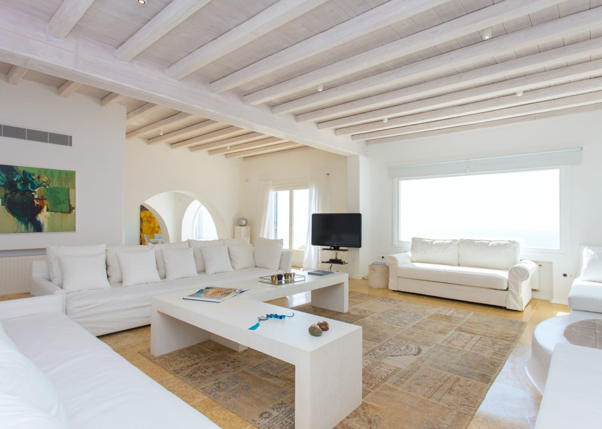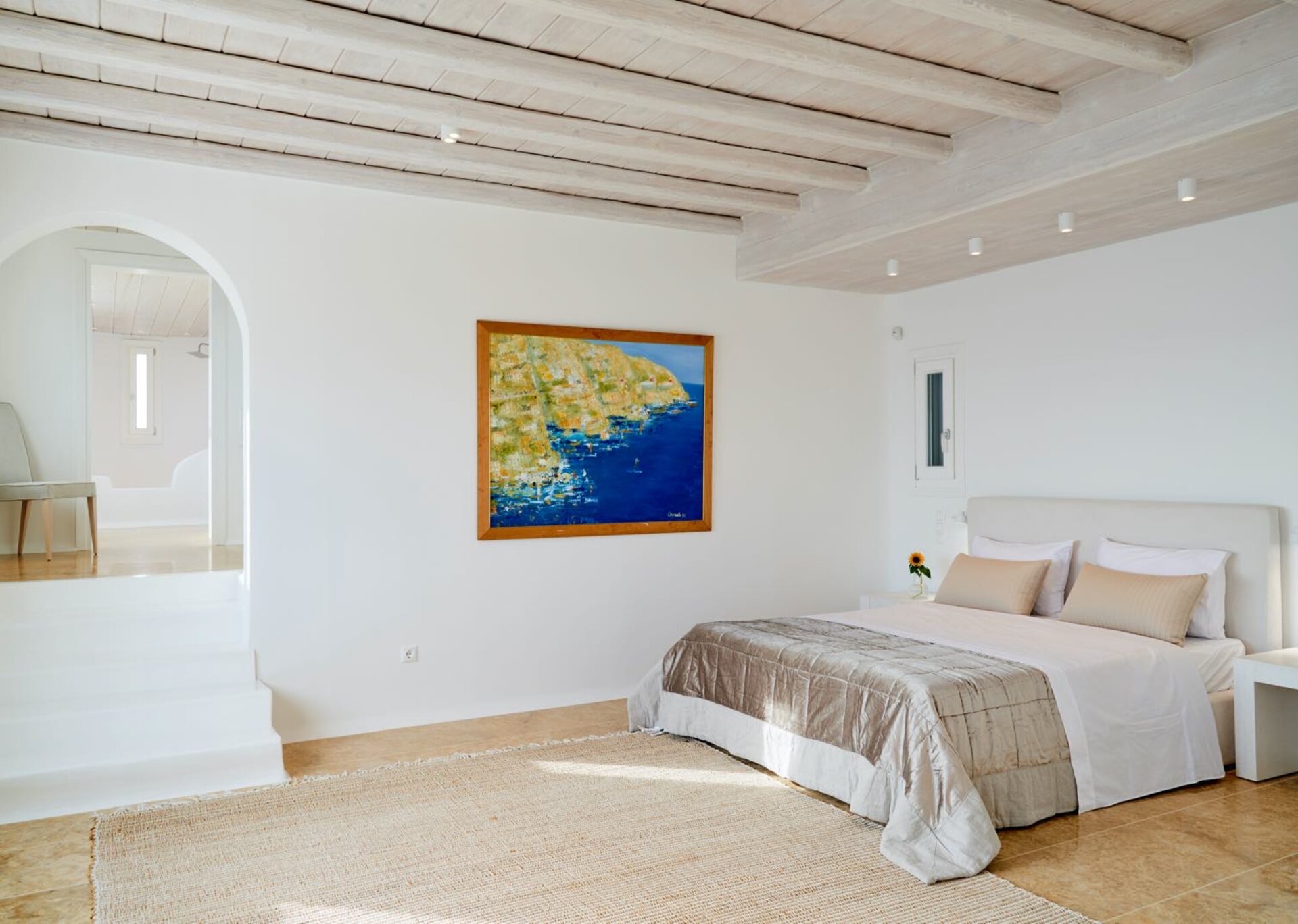 The interiors are the epitome of discreet luxury. White-washed, lavishly decorated, enriched with numerous authentic paintings, they skillfully mix contemporary design with art and connect the three levels in one and only atmosphere. The pool level contains the living and dining areas together with a fully-equipped modern kitchen, directly accessed to the outdoors. From white to creamy, soft beige and pale gray, the color palette emphasizes the natural light that deluges generously inside.