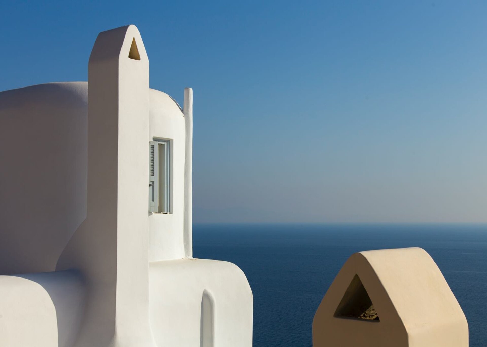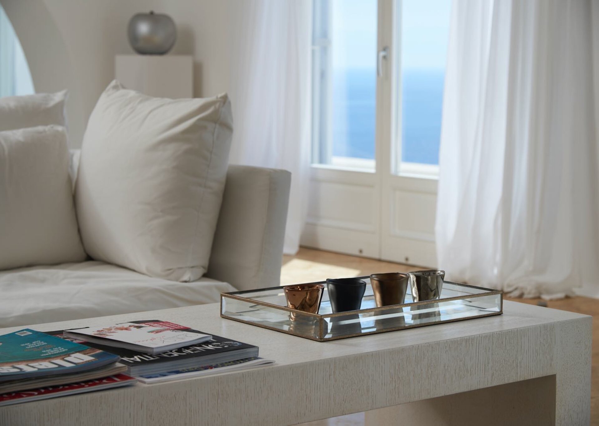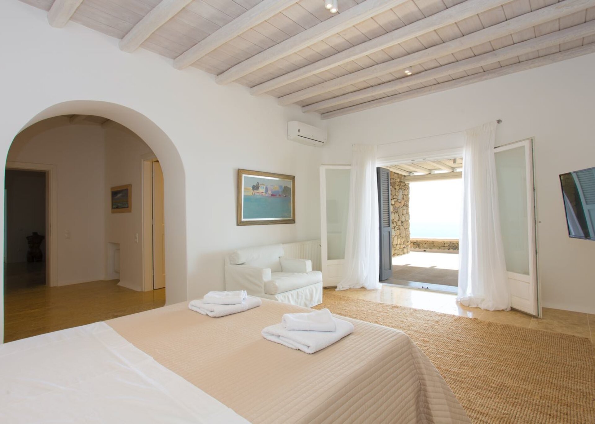 The interiors are the epitome of discreet luxury. White-washed, lavishly decorated, enriched with numerous authentic paintings, they skillfully mix contemporary design with art and connect the three levels in one and only atmosphere. The pool level contains the living and dining areas together with a fully-equipped modern kitchen, directly accessed to the outdoors. From white to creamy, soft beige and pale gray, the color palette emphasizes the natural light that deluges generously inside.