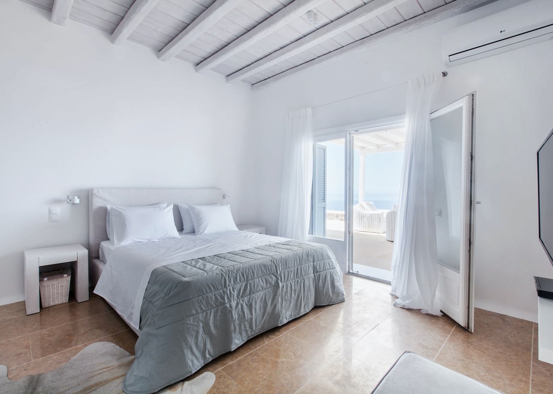The seven bedrooms, all with en-suite bathrooms, benefit from the slope of the cliff edge and provide magnificent view of the sea, even when somebody is lying in any one of the beds. Especially when stepping into the oversize master suite with the large windows and the private panoramic balcony, you will feel like flying over the Aegean sea. It's no wonder that Mykonos is one of the most beautiful places in the world, when you consider the sugar-cube houses, the cobalt blue sea and the sandy beaches. The island has an ambiance touch for everyone, either they are looking for restful vacation or lots of nightlife. Villa Zelie is a splendid retreat, while savoring the very best Mykonos has to offer, only a couple of km from downtown.