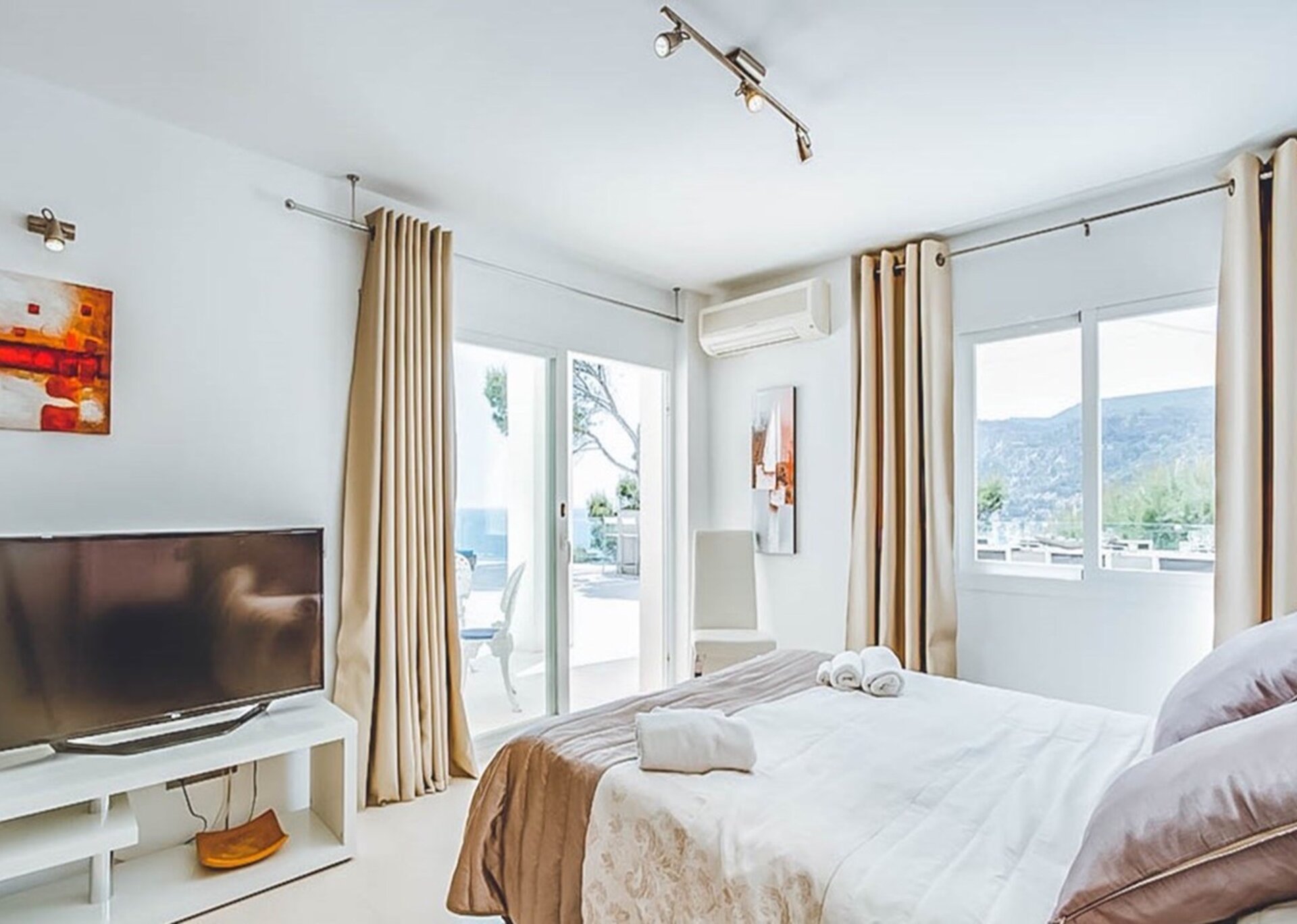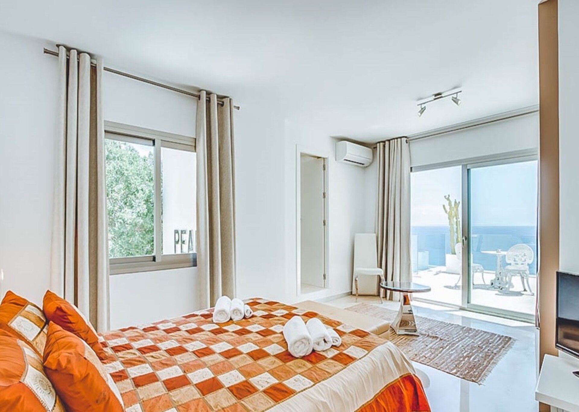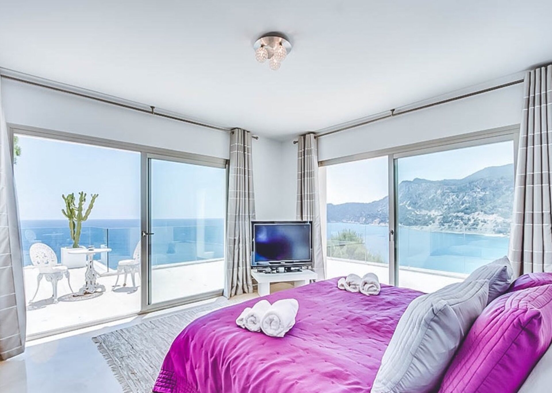 Inside, the villa boasts various lounges and dining areas, along with a state-of-the-art, fully equipped kitchen. Elegantly furnished and adorned with top-notch fixtures and furnishings, each room exudes summer vibes and seamlessly connects to the accessible outdoor terraces. The villa offers six luxuriously furnished double bedrooms, complete with their own en-suite bathrooms and breathtaking views. As an added touch of indulgence and relaxation, the two master suites even feature an inviting Jacuzzi bath.