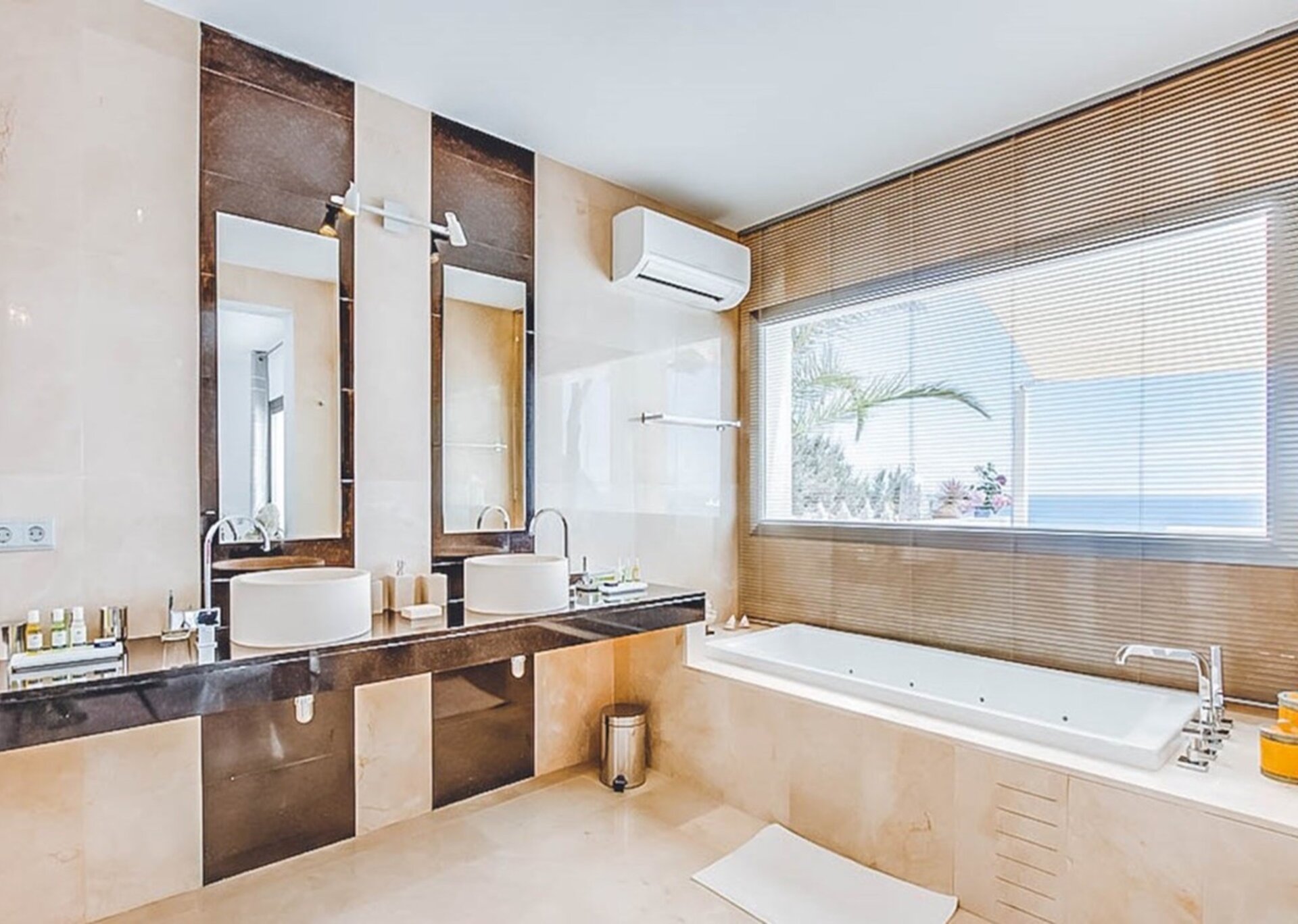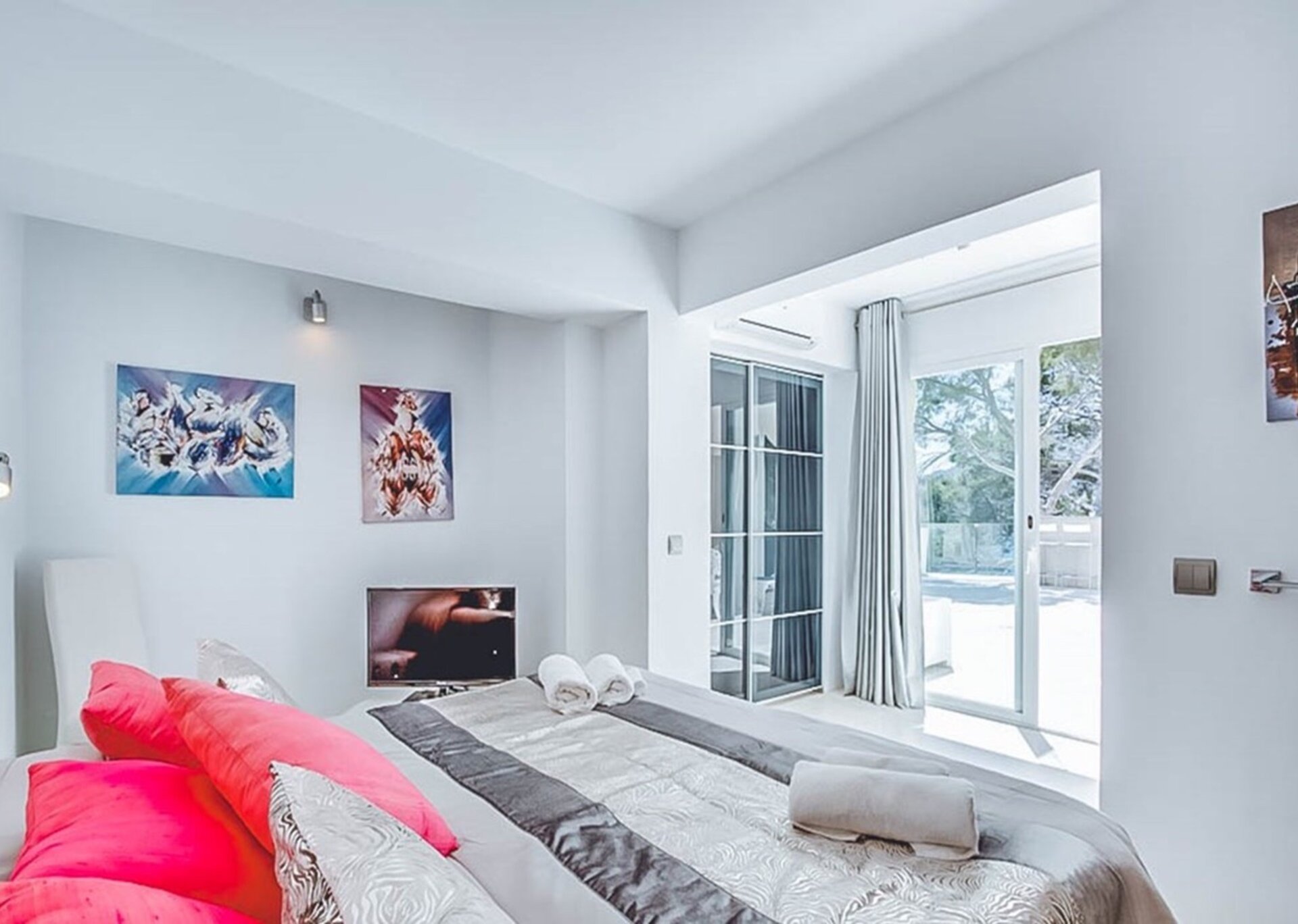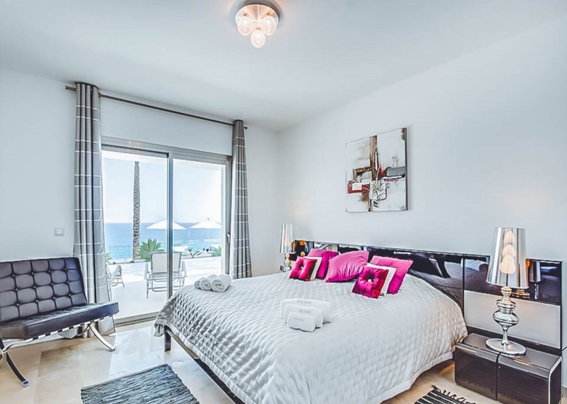 Inside, the villa boasts various lounges and dining areas, along with a state-of-the-art, fully equipped kitchen. Elegantly furnished and adorned with top-notch fixtures and furnishings, each room exudes summer vibes and seamlessly connects to the accessible outdoor terraces. The villa offers six luxuriously furnished double bedrooms, complete with their own en-suite bathrooms and breathtaking views. As an added touch of indulgence and relaxation, the two master suites even feature an inviting Jacuzzi bath.